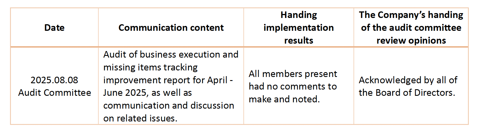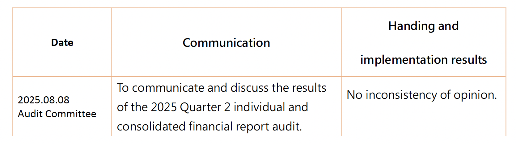 The certified public accountant communicates with the independent directors at the audit committee meetings on a quarterly basis regarding the review results or financial statement audits of the Company and its subsidiaries, and has reached consensus on relevant matters through adequate and excellent communication.