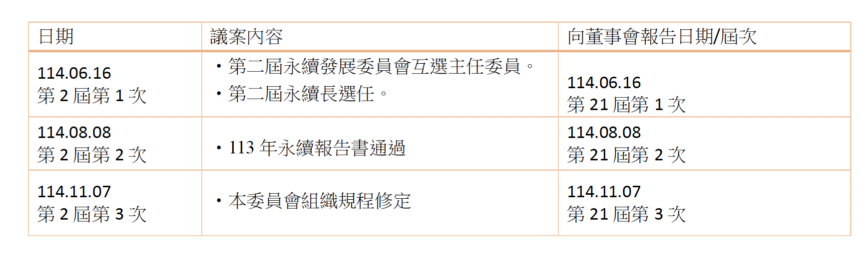 永續發展委員114年度開會3次,委員實際出席率(不含委託出席)為100%,.