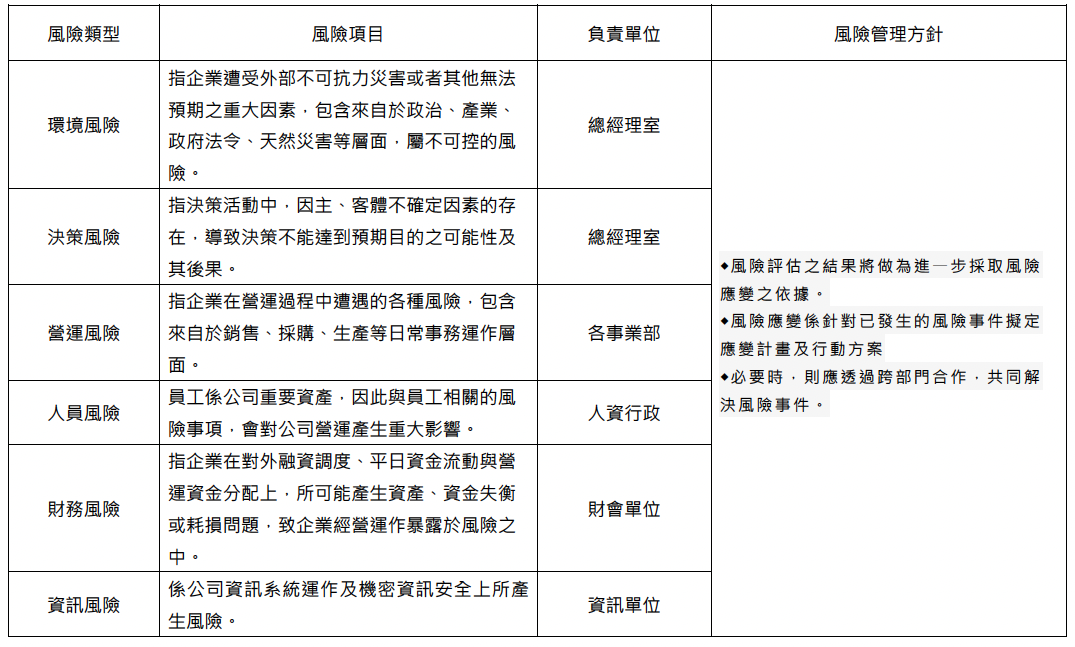 本公司風險管理包括策略風險、營運風險、財務風險、環境風險、法規風險等層面之風險管理。